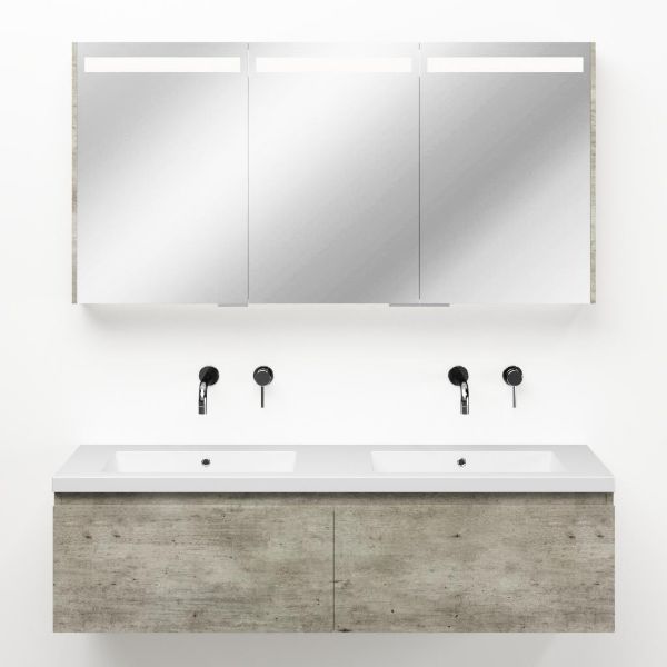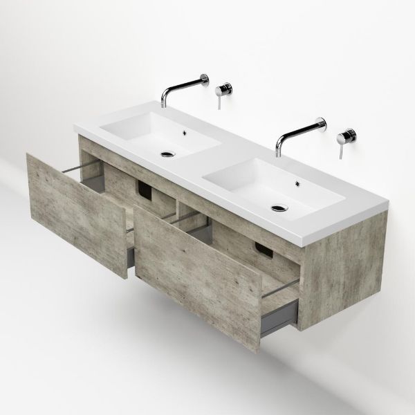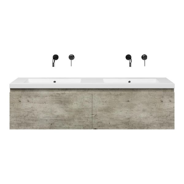 | | Bellanti Solo/Esta-Q badmeubel 140x46 2 softclose laden steigerhout look grijs greeploos quartz wastafel dubbel mat wit zonder kraangaten |