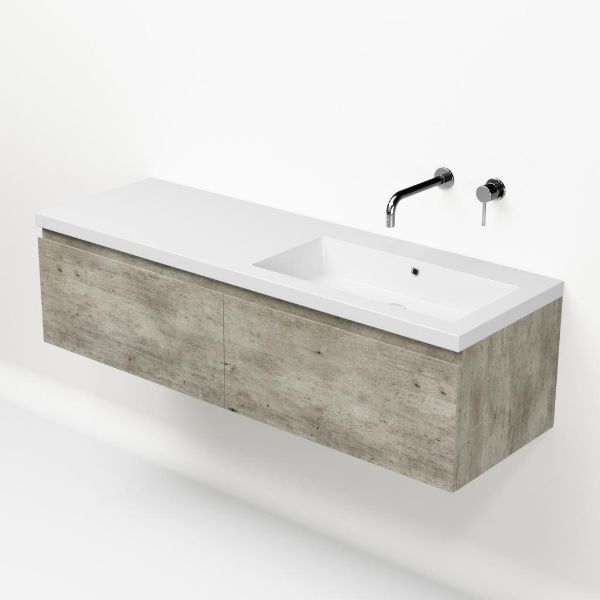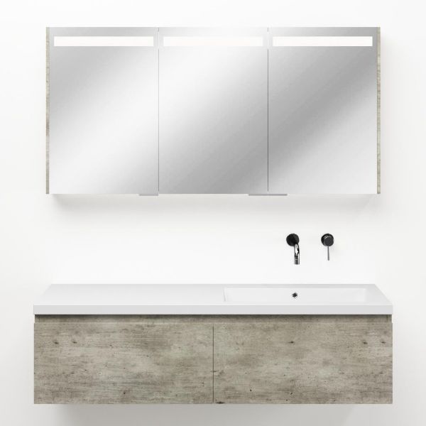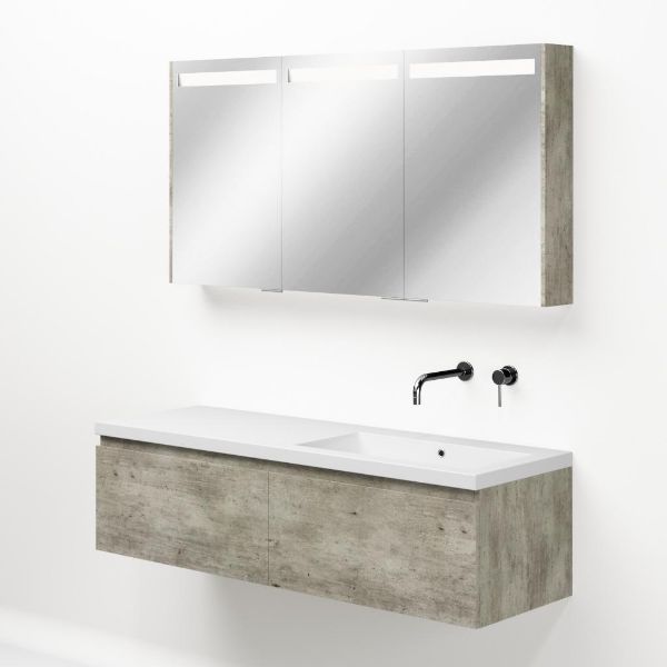 Greeploos badkamermeubel in de kleur steigerhout licht grijs is 140 cm breed.  De wastafel is vervaardig in polystone en heeft de kleur wit. Dit badkamermeubel met deze wastafel is leverbaar tussen de 60 cm t/m 160 cm