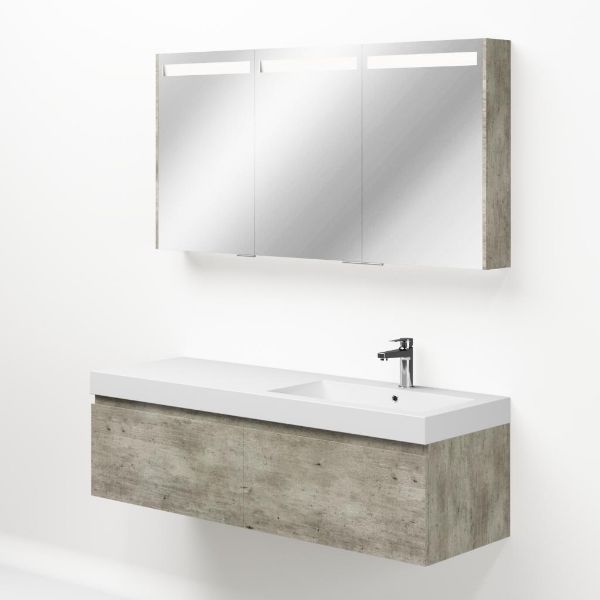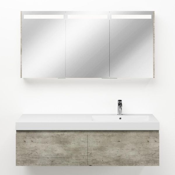 Greeploos badkamermeubel in de kleur steigerhout licht grijs is 140 cm breed.  De wastafel is vervaardig in polystone en heeft de kleur wit. Dit badkamermeubel met deze wastafel is leverbaar tussen de 60 cm t/m 160 cm