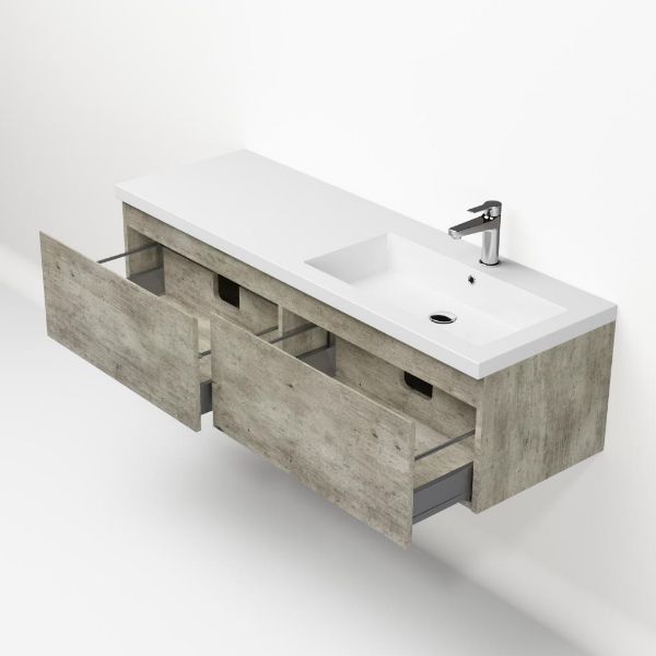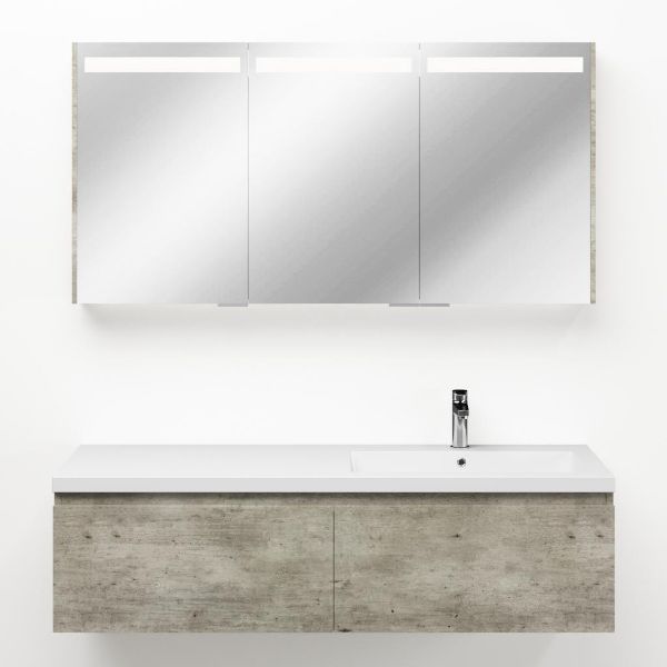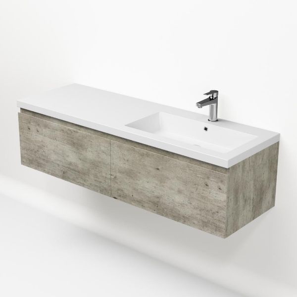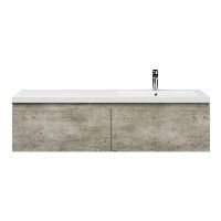 Greeploos badkamermeubel in de kleur steigerhout licht grijs is 140 cm breed.  De wastafel is vervaardig in polystone en heeft de kleur wit. Dit badkamermeubel met deze wastafel is leverbaar tussen de 60 cm t/m 160 cm