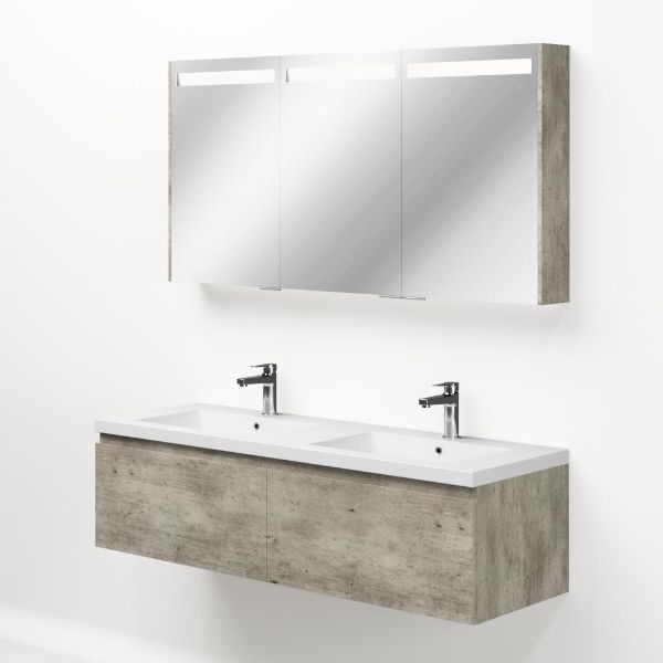 Greeploos badkamermeubel in de kleur steigerhout licht grijs is 140 cm breed.  De wastafel is vervaardig in polystone en heeft de kleur wit. Dit badkamermeubel met deze wastafel is leverbaar tussen de 60 cm t/m 160 cm