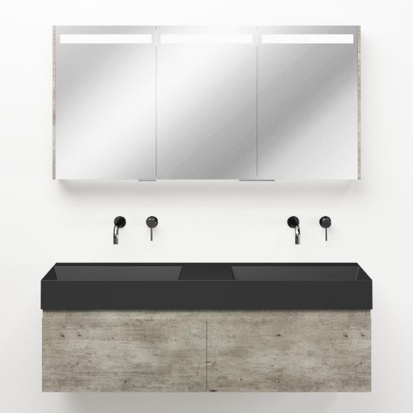 Greeploos badkamermeubel in de kleur steigerhout licht grijs is 140 cm breed. De wastafel is vervaardig in keramiek en heeft de kleur antraciet mat keramiek. Dit badkamermeubel met deze wastafel is leverbaar tussen de 60 cm t/m 160 cm