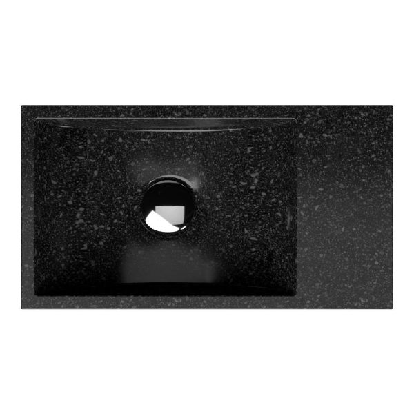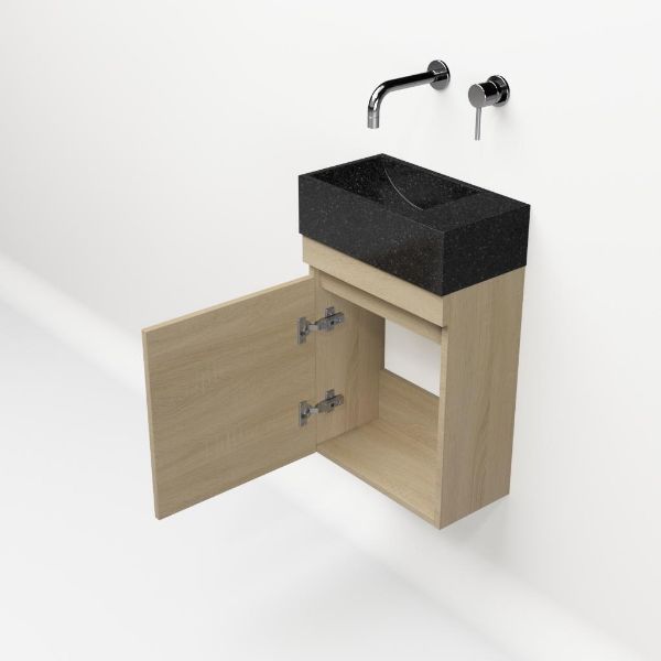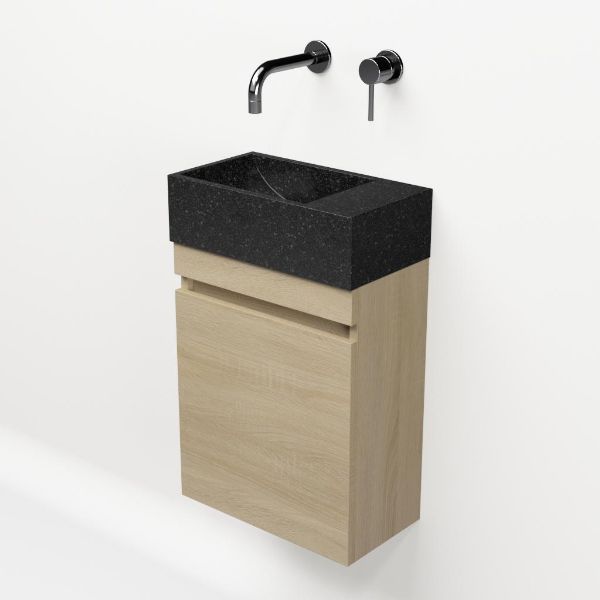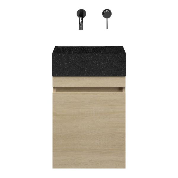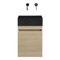 Greeploos fonteinmeubel in de kleur eiken licht is 40 cm breed. De wastafel is vervaardig in natuursteen en heeft de kleur shanxi black met 0 kraangaten