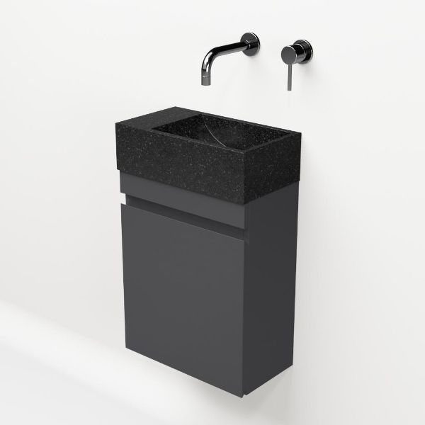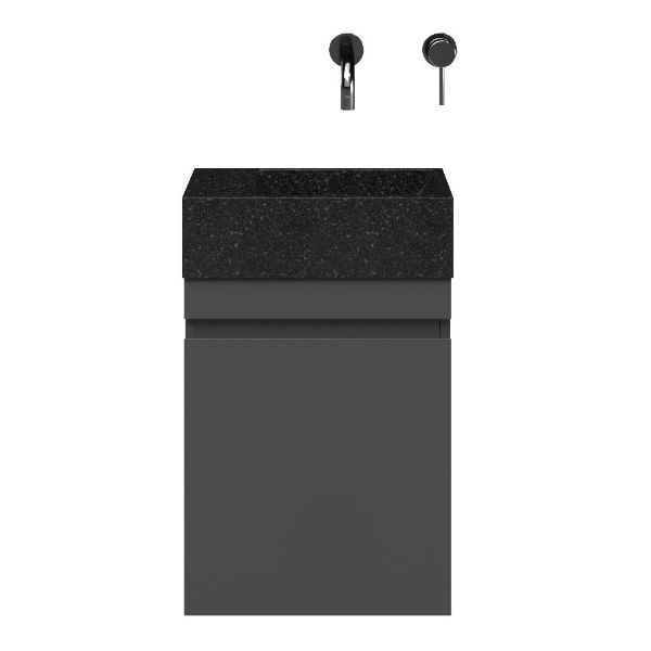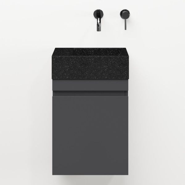 Greeploos fonteinmeubel in de kleur antraciet mat is 40 cm breed. De wastafel is vervaardig in natuursteen en heeft de kleur shanxi black met 0 kraangaten