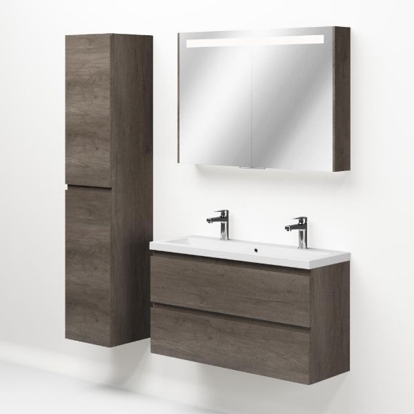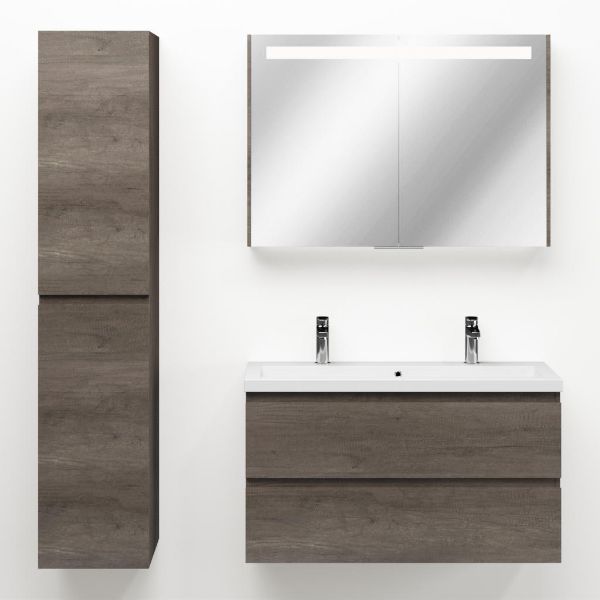 Ondiepe greeploos badkamermeubel in de kleur olm donker grijs. Badmeubel is praktisch voor een compact badkamer. Het meubel van 100 cm breed is er. De wastafel is vervaardig in polystone en heeft de kleur wit. Dit badkamermeubel met deze wastafel is leverbaar tussen de 60 cm t/m 120 cm.