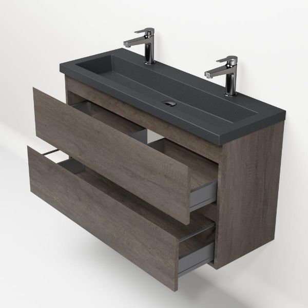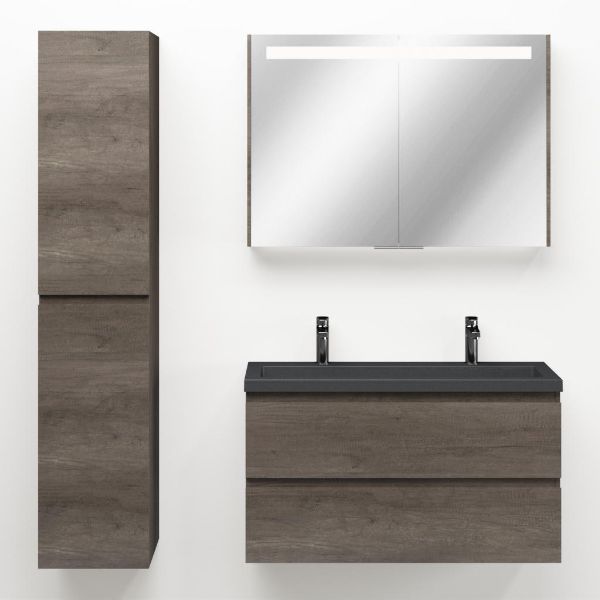 Ondiepe greeploos badkamermeubel in de kleur olm donker grijs. Badmeubel is praktisch voor een compact badkamer. Het meubel van 100 cm breed is er. De wastafel is vervaardig in quartz en heeft de kleur grijs mat quartz. Dit badkamermeubel met deze wastafel is leverbaar tussen de 60 cm t/m 120 cm.