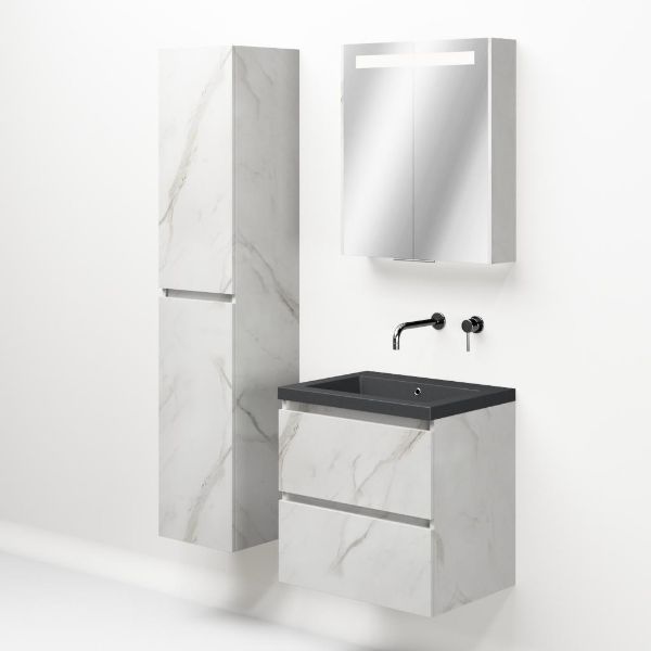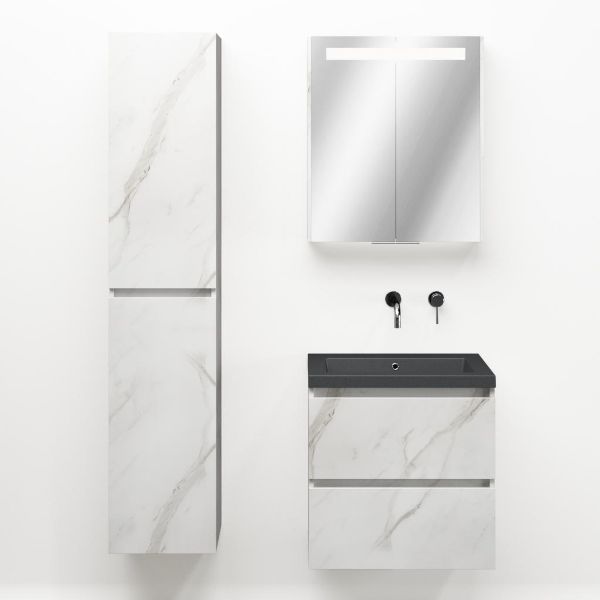 Greeploos badkamermeubel in de kleur marmer wit is 60 cm breed.  De wastafel is vervaardig in quartz en heeft de kleur grijs mat quartz. Dit badkamermeubel met deze wastafel is leverbaar tussen de 60 cm t/m 200 cm