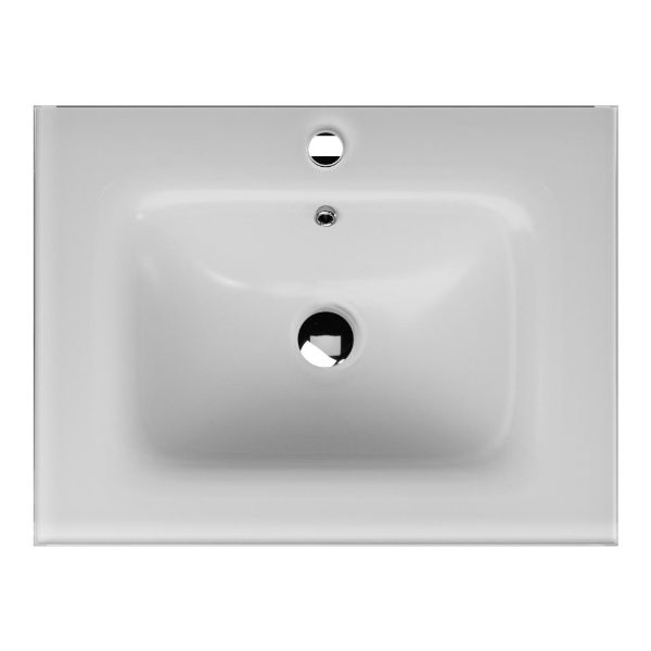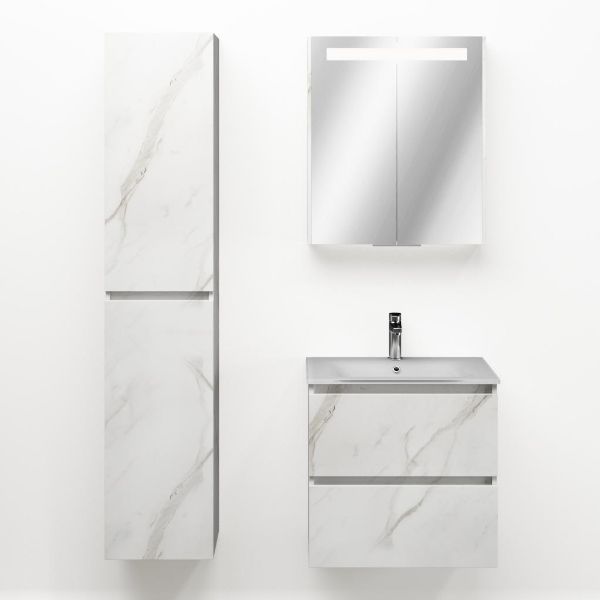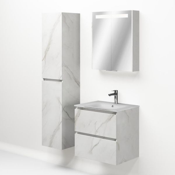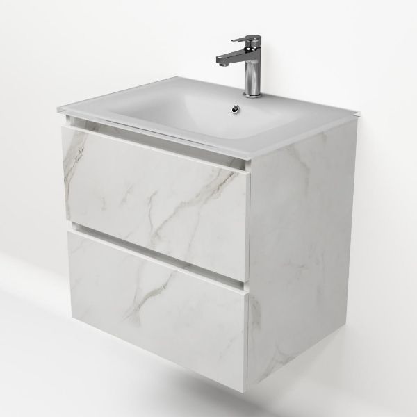 Greeploos badkamermeubel in de kleur marmer wit is 60 cm breed. De wastafel is vervaardig in glas en heeft de kleur wit. Dit badkamermeubel met deze wastafel is leverbaar tussen de 60 cm t/m 120 cm