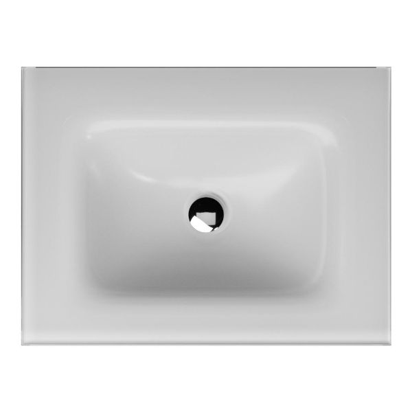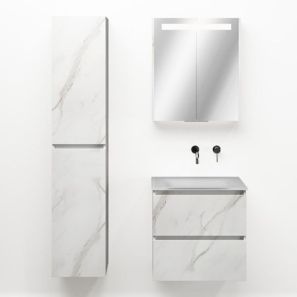 Greeploos badkamermeubel in de kleur marmer wit is 60 cm breed. De wastafel is vervaardig in glas en heeft de kleur wit. Dit badkamermeubel met deze wastafel is leverbaar tussen de 60 cm t/m 120 cm