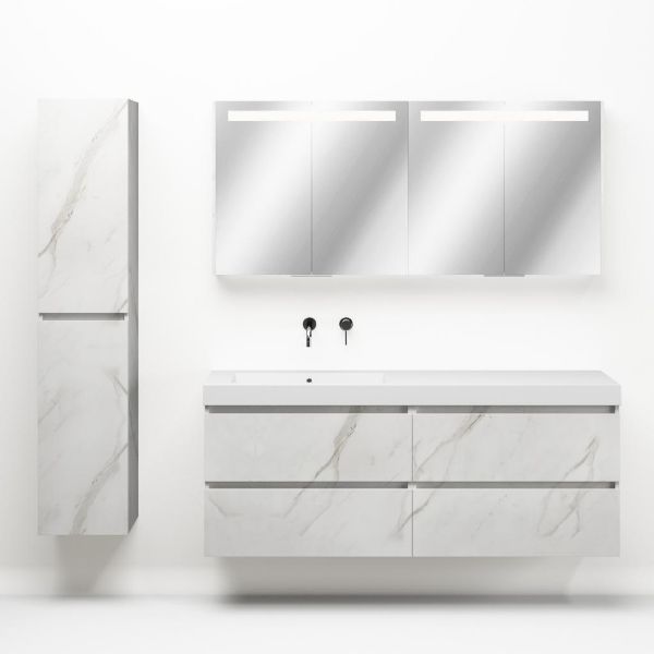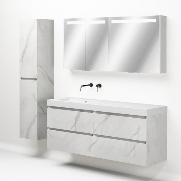 Greeploos badkamermeubel in de kleur marmer wit is 160 cm breed. De wastafel is vervaardig in polystone en heeft de kleur wit. Dit badkamermeubel met deze wastafel is leverbaar tussen de 60 cm t/m 200 cm