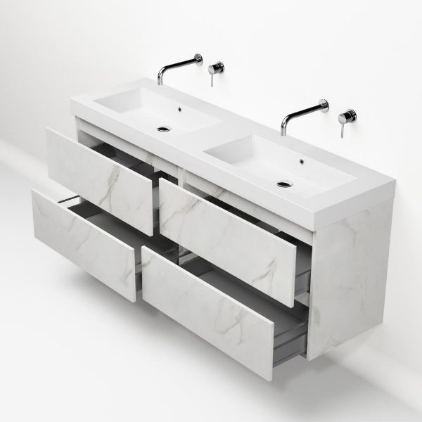 Bellanti Elena/Esta badmeubel 160x46 4 softclose laden marmer structuur wit greeploos polystone dubbele wastafel wit zonder kraangaten