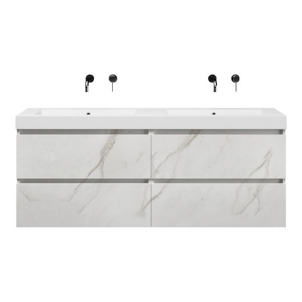 Greeploos badkamermeubel in de kleur marmer wit is 160 cm breed.  De wastafel is vervaardig in polystone en heeft de kleur wit. Dit badkamermeubel met deze wastafel is leverbaar tussen de 60 cm t/m 200 cm