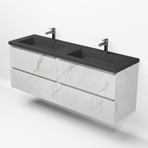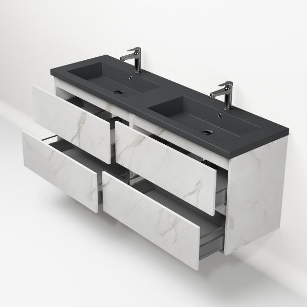 Bellanti Elena/Esta-Q badmeubel 160x46 4 softclose laden marmer structuur wit greeploos polystone dubbele wastafel mat grijs 2 kraangaten