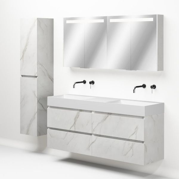 Greeploos badkamermeubel in de kleur marmer wit is 160 cm breed. De wastafel is vervaardig in keramiek en heeft de kleur wit mat keramiek. Dit badkamermeubel met deze wastafel is leverbaar tussen de 60 cm t/m 120 cm