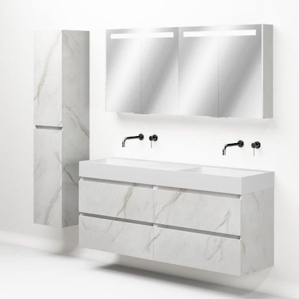 Greeploos badkamermeubel in de kleur marmer wit is 160 cm breed. De wastafel is vervaardig in keramiek en heeft de kleur wit keramiek. Dit badkamermeubel met deze wastafel is leverbaar tussen de 60 cm t/m 120 cm