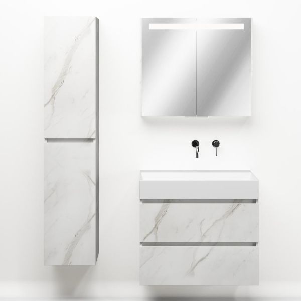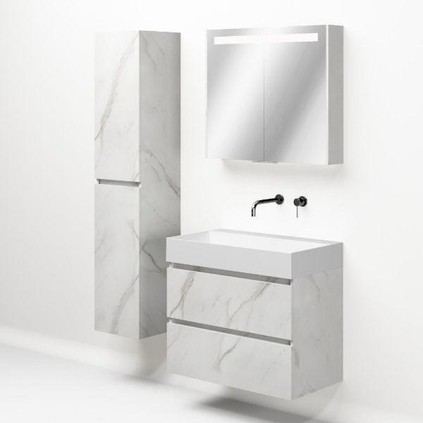 Greeploos badkamermeubel in de kleur marmer wit is 80 cm breed. De wastafel is vervaardig in keramiek en heeft de kleur wit mat keramiek. Dit badkamermeubel met deze wastafel is leverbaar tussen de 60 cm t/m 120 cm