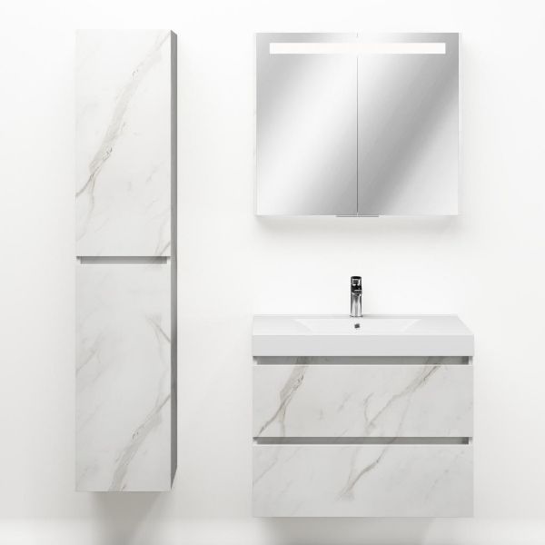 Greeploos badkamermeubel in de kleur marmer wit is 80 cm breed. De wastafel is vervaardig in polystone en heeft de kleur wit. Dit badkamermeubel met deze wastafel is leverbaar tussen de 60 cm t/m 200 cm