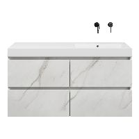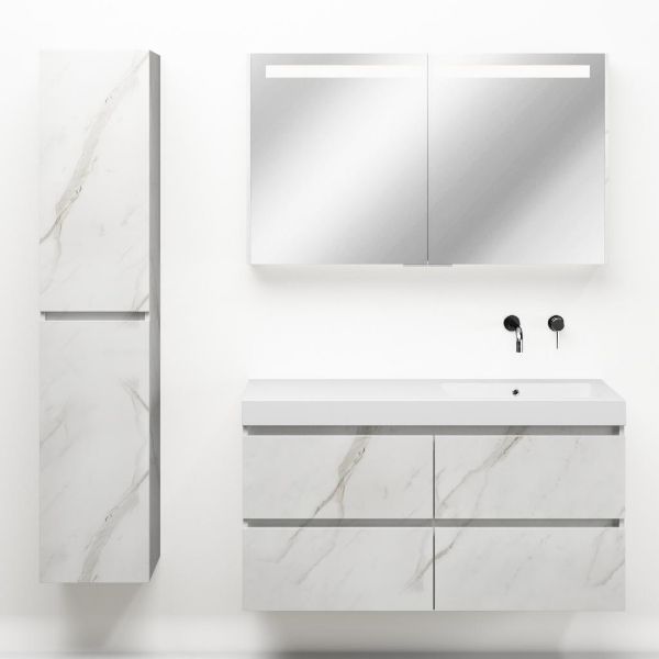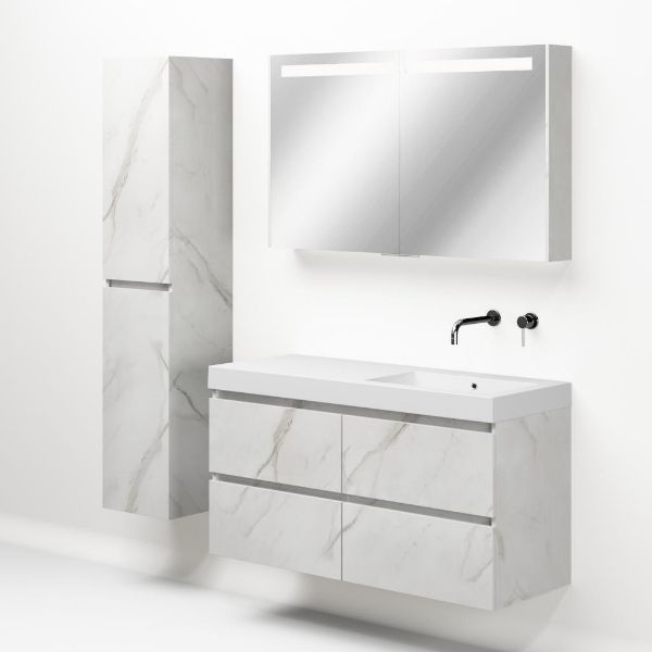 Greeploos badkamermeubel in de kleur marmer wit is 120 cm breed.  De wastafel is vervaardig in polystone en heeft de kleur wit. Dit badkamermeubel met deze wastafel is leverbaar tussen de 60 cm t/m 200 cm