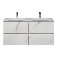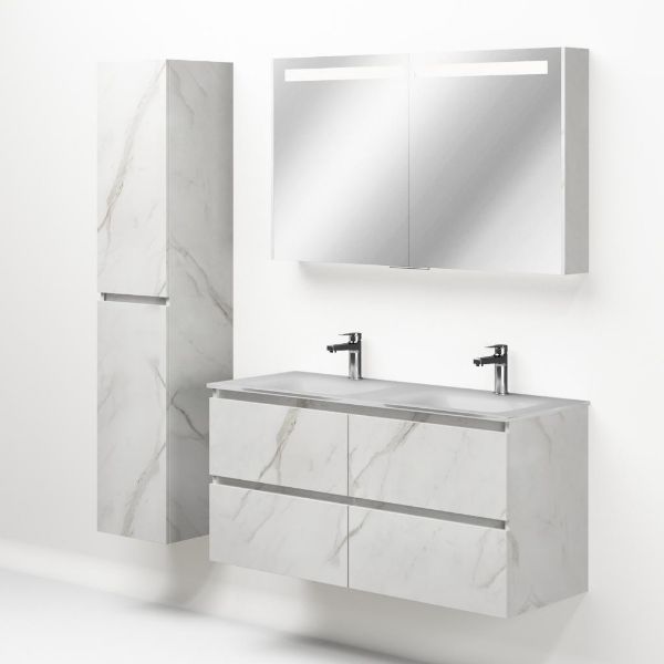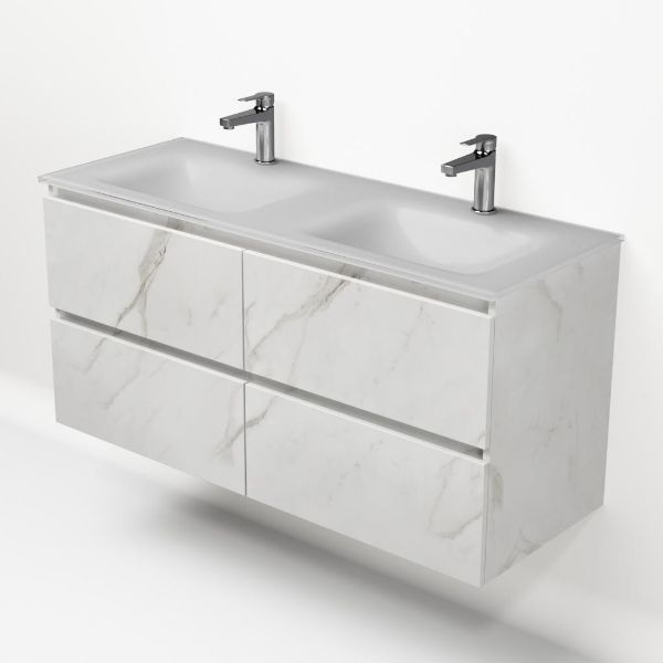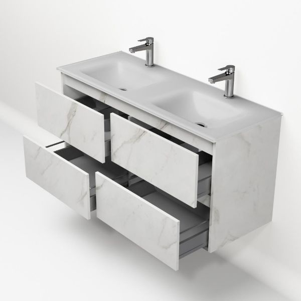 | Bellanti Elena/Glass badmeubel 120x46 4 softclose laden marmer structuur wit greeploos glazen wastafel dubbel wit met 2 kraangaten |