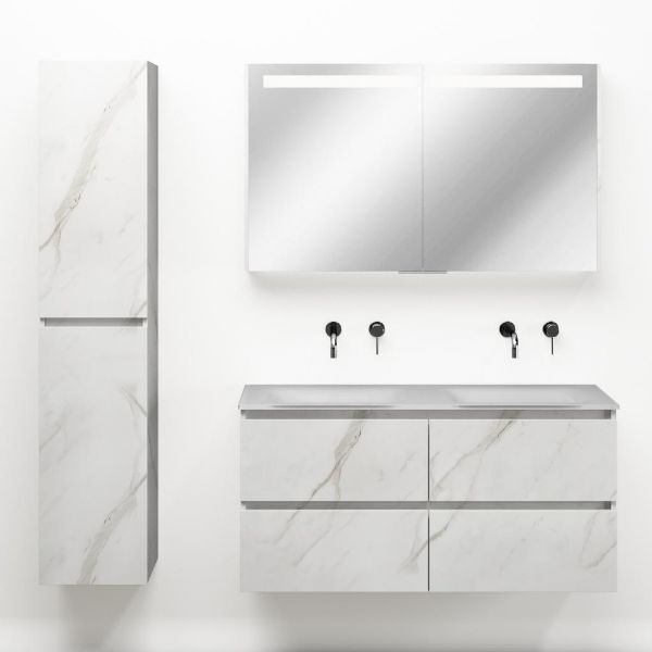| Bellanti Elena/Glass badmeubel 120x46 4 softclose laden marmer structuur wit greeploos glazen wastafel dubbel wit zonder kraangaten |