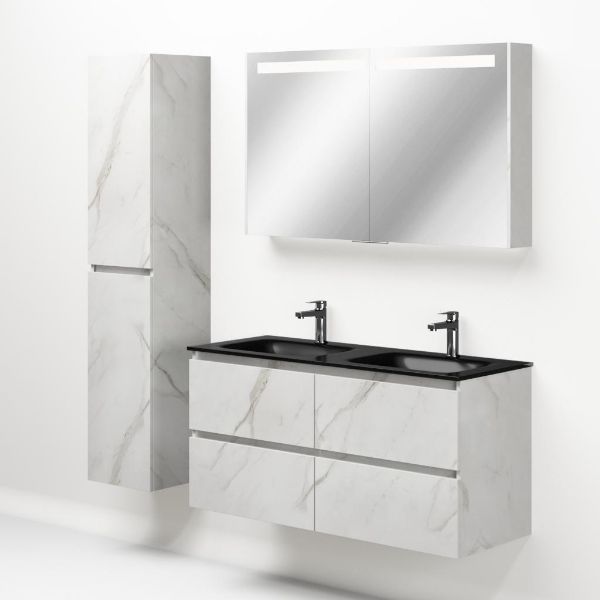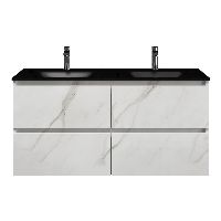 | Bellanti Elena/Glass badmeubel 120x46 4 softclose laden marmer structuur wit greeploos glazen wastafel dubbel zwart met 2 kraangaten |