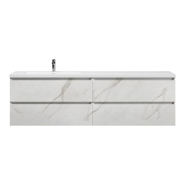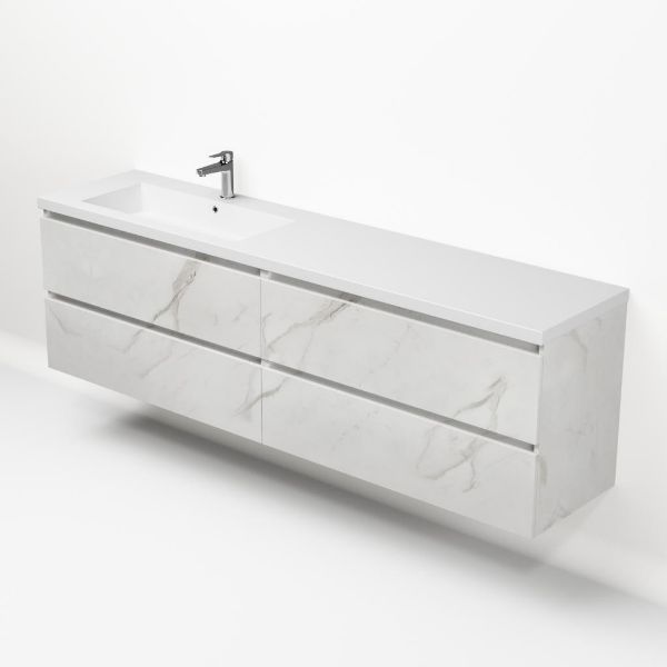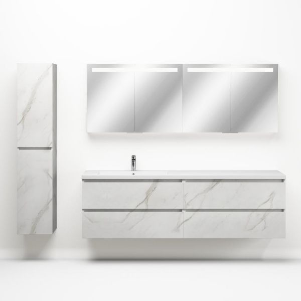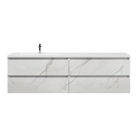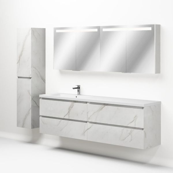 Greeploos badkamermeubel in de kleur marmer wit is 200 cm breed. De wastafel is vervaardig in polystone en heeft de kleur wit. Dit badkamermeubel met deze wastafel is leverbaar tussen de 60 cm t/m 200 cm
