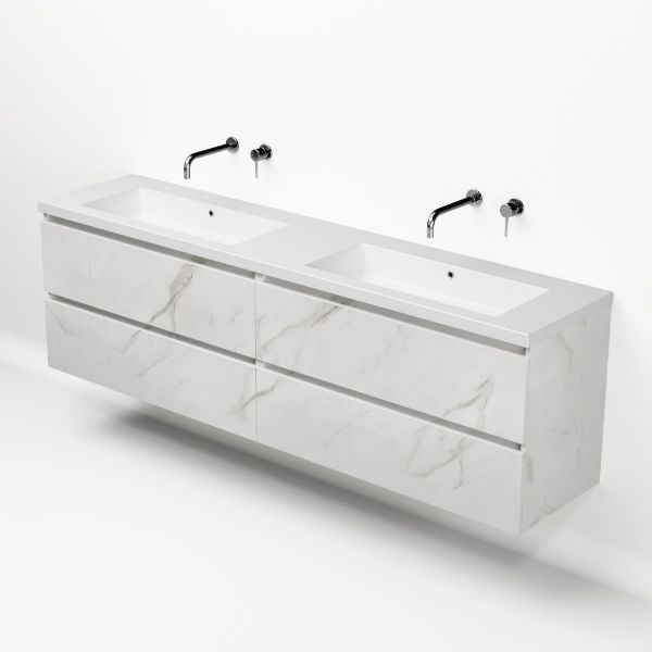 | | Bellanti Elena/Esta-q badmeubel 200x46 4 softclose laden marmer structuur wit greeploos quartz dubbele wastafel mat wit zonder kraangaten |