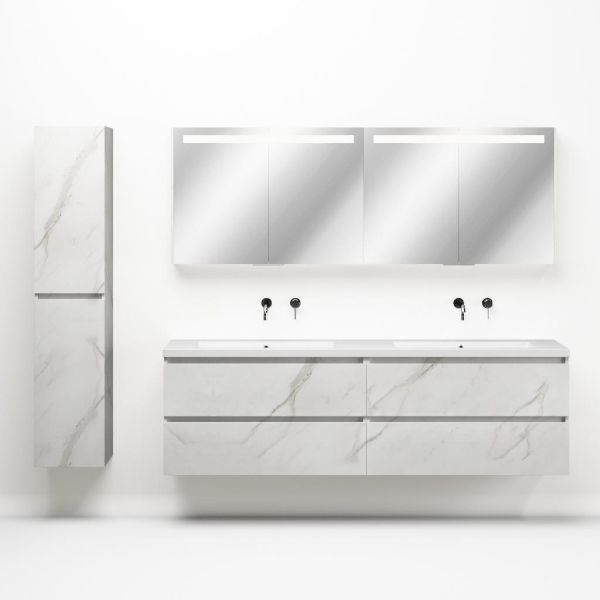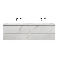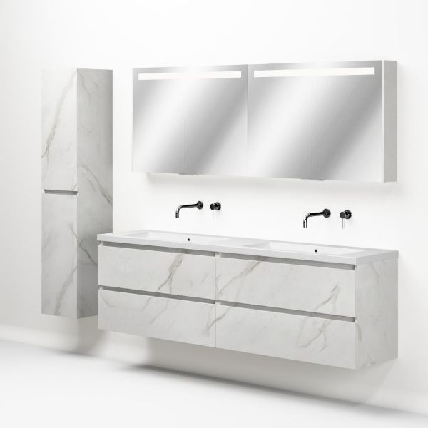 Greeploos badkamermeubel in de kleur marmer wit is 200 cm breed. De wastafel is vervaardig in quartz en heeft de kleur wit mat quartz. Dit badkamermeubel met deze wastafel is leverbaar tussen de 60 cm t/m 200 cm