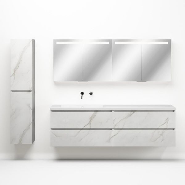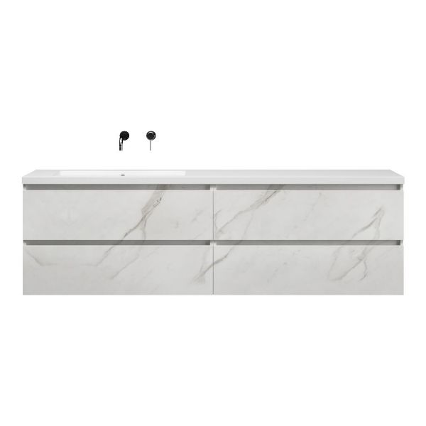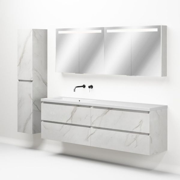 Greeploos badkamermeubel in de kleur marmer wit is 200 cm breed. De wastafel is vervaardig in quartz en heeft de kleur wit mat quartz. Dit badkamermeubel met deze wastafel is leverbaar tussen de 60 cm t/m 200 cm