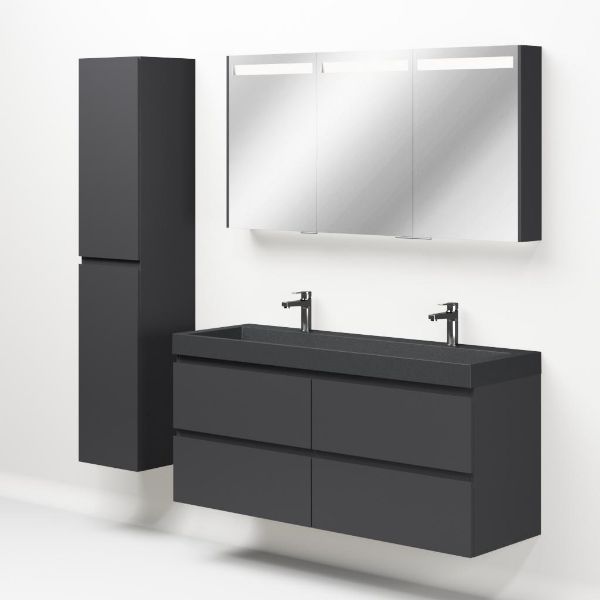 Greeploos badkamermeubel in de kleur antraciet mat is 140 cm breed. De wastafel is vervaardig in quartz en heeft de kleur grijs mat quartz. Dit badkamermeubel met deze wastafel is leverbaar tussen de 60 cm t/m 140 cm