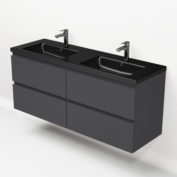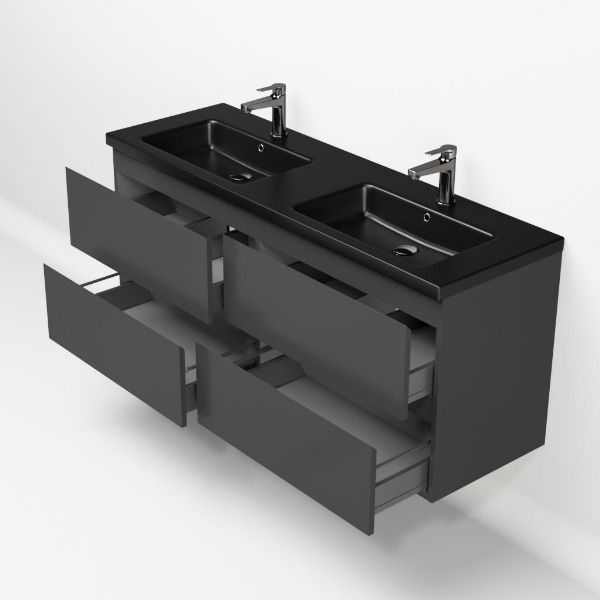 | | Bellanti Gisella/Amelia badmeubel 140x46 4 softclose laden antraciet mat greeploos keramiek wastafel dubbel mat zwart met 2 kraangaten |
