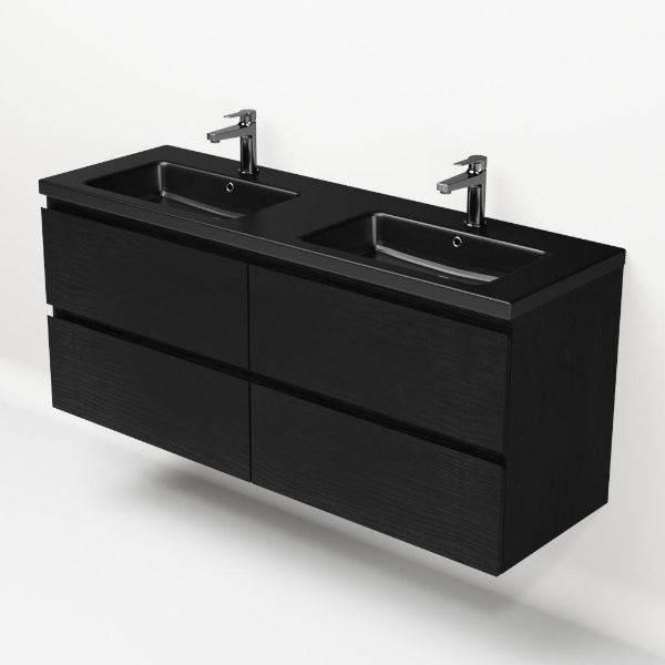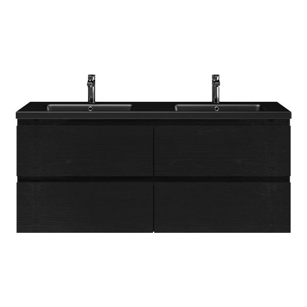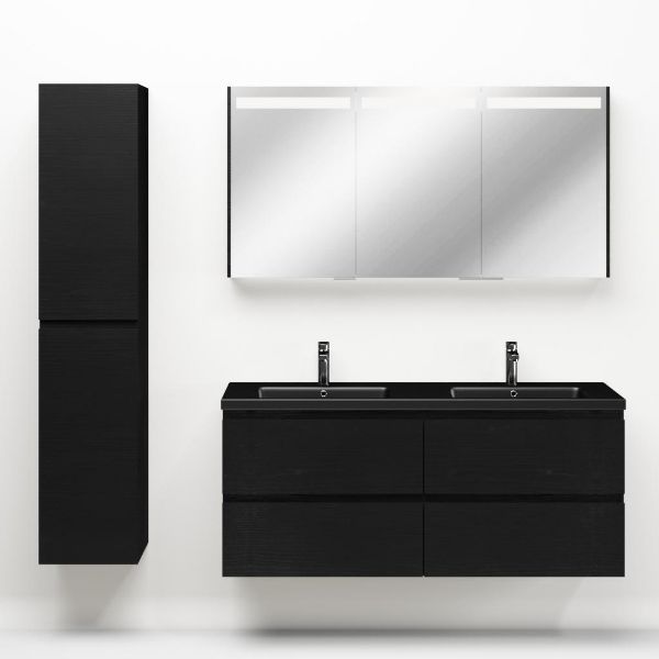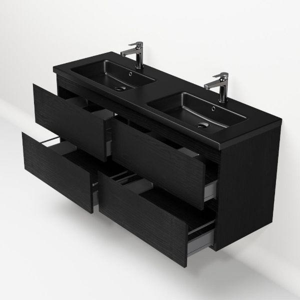 | | Bellanti Gisella/Amelia badmeubel 140x46 4 softclose laden zwart mat eiken greeploos keramiek wastafel dubbel mat zwart met 2 kraangaten |