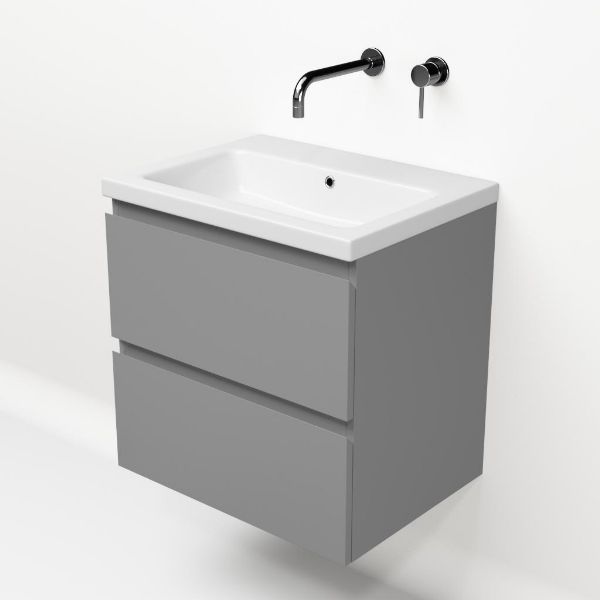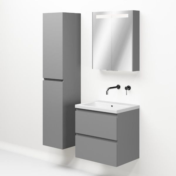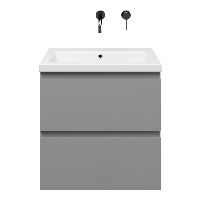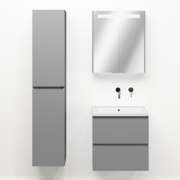 Greeploos badkamermeubel in de kleur licht grijs mat is 60 cm breed. De wastafel is vervaardig in keramiek en heeft de kleur wit keramiek. Dit badkamermeubel met deze wastafel is leverbaar tussen de 60 cm t/m 120 cm