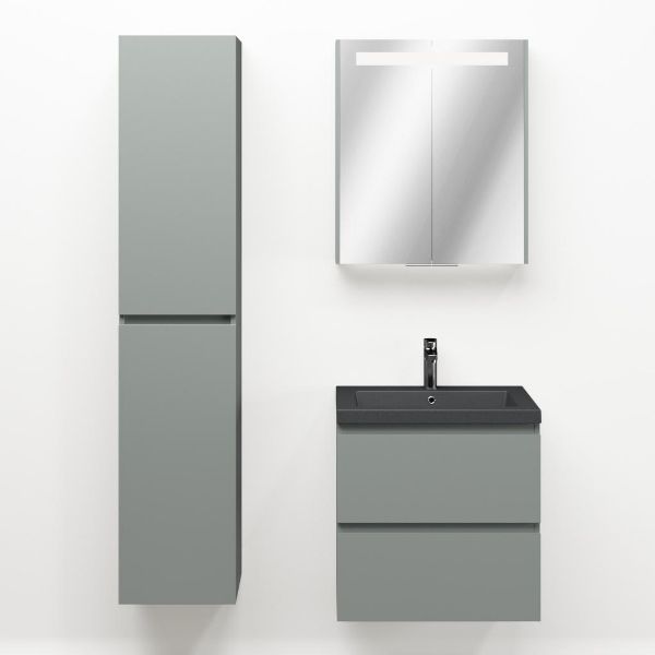 Greeploos badkamermeubel in de kleur licht grijs mat is 60 cm breed. De wastafel is vervaardig in quartz en heeft de kleur grijs mat quartz. Dit badkamermeubel met deze wastafel is leverbaar tussen de 60 cm t/m 200 cm
