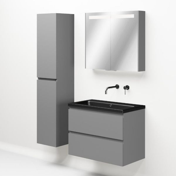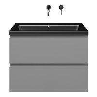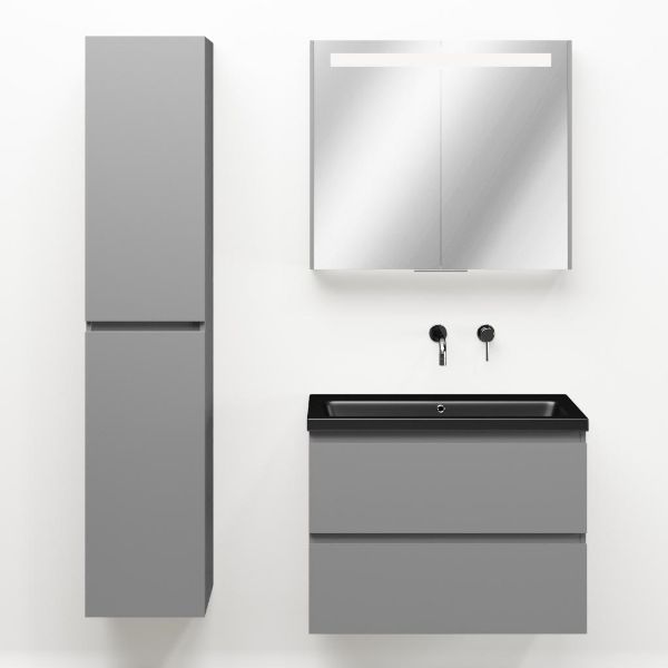 Greeploos badkamermeubel in de kleur licht grijs mat is 80 cm breed. De wastafel is vervaardig in keramiek en heeft de kleur zwart mat keramiek. Dit badkamermeubel met deze wastafel is leverbaar tussen de 60 cm t/m 120 cm