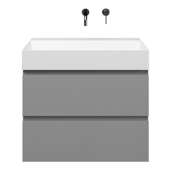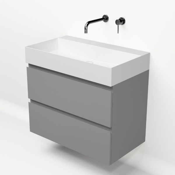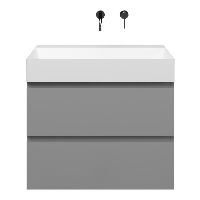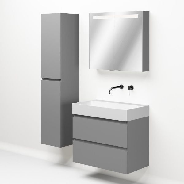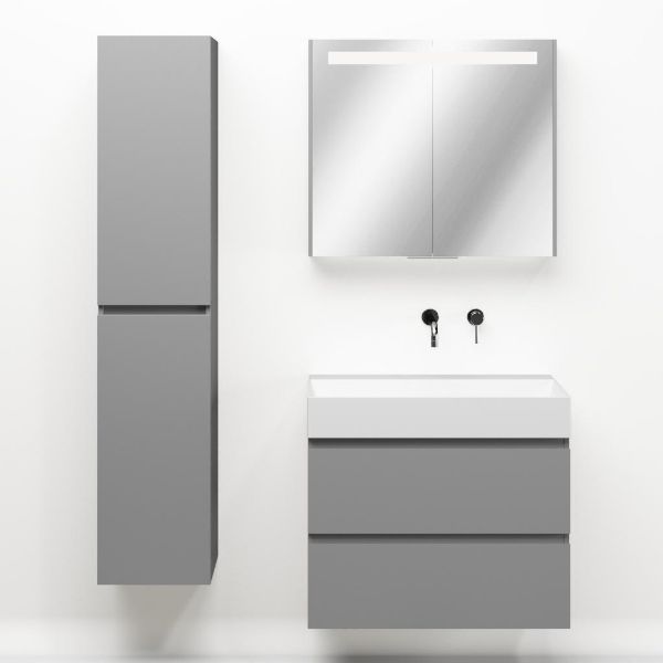 Greeploos badkamermeubel in de kleur licht grijs mat is 80 cm breed. De wastafel is vervaardig in keramiek en heeft de kleur wit mat keramiek. Dit badkamermeubel met deze wastafel is leverbaar tussen de 60 cm t/m 160 cm