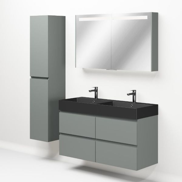 Greeploos badkamermeubel in de kleur licht grijs mat is 120 cm breed.  De wastafel is vervaardig in keramiek en heeft de kleur antraciet mat keramiek. Dit badkamermeubel met deze wastafel is leverbaar tussen de 60 cm t/m 160 cm