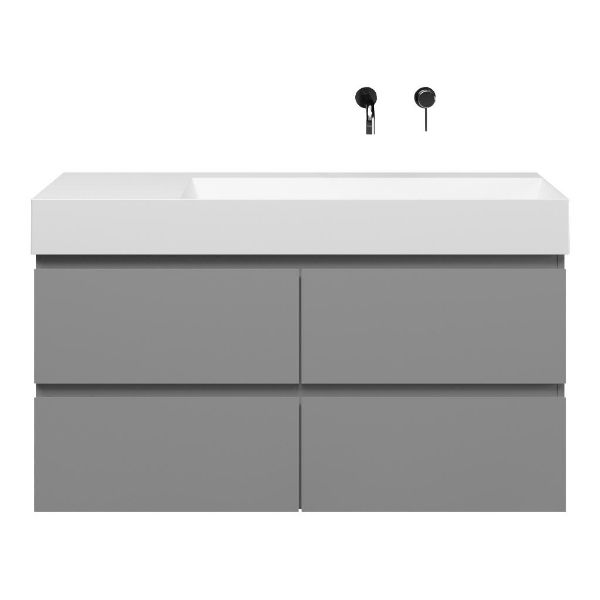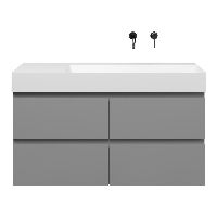 Greeploos badkamermeubel in de kleur licht grijs mat is 120 cm breed. De wastafel is vervaardig in keramiek en heeft de kleur wit mat keramiek. Dit badkamermeubel met deze wastafel is leverbaar tussen de 60 cm t/m 160 cm