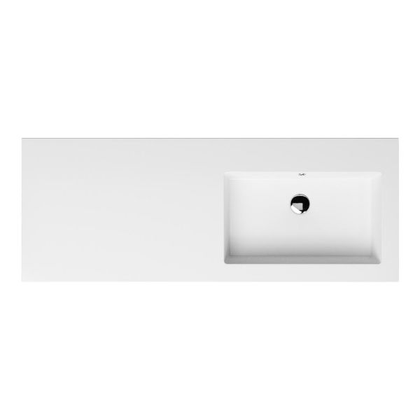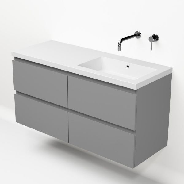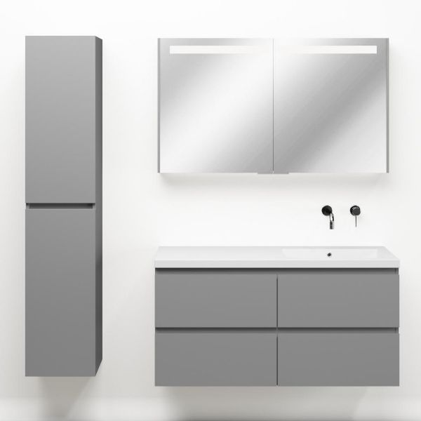 Greeploos badkamermeubel in de kleur licht grijs mat is 120 cm breed. De wastafel is vervaardig in polystone en heeft de kleur wit. Dit badkamermeubel met deze wastafel is leverbaar tussen de 60 cm t/m 200 cm