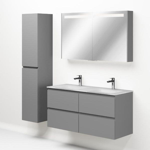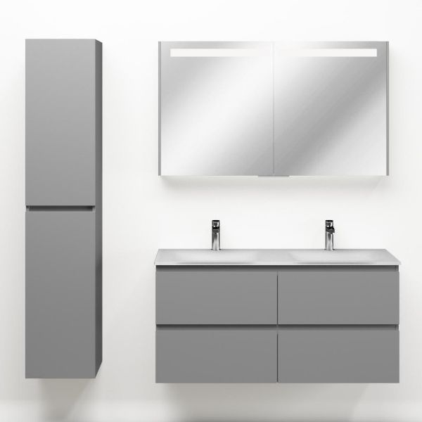 Greeploos badkamermeubel in de kleur licht grijs mat is 120 cm breed. De wastafel is vervaardig in glas en heeft de kleur wit. Dit badkamermeubel met deze wastafel is leverbaar tussen de 60 cm t/m 140 cm