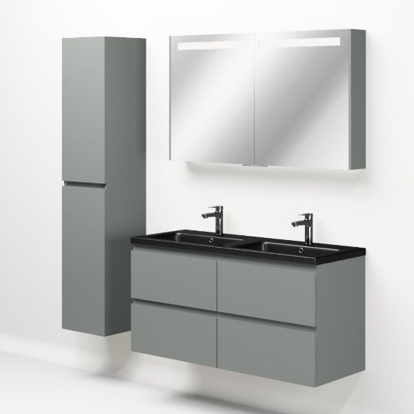 Greeploos badkamermeubel in de kleur licht grijs mat is 120 cm breed. De wastafel is vervaardig in keramiek en heeft de kleur zwart mat keramiek. Dit badkamermeubel met deze wastafel is leverbaar tussen de 60 cm t/m 120 cm