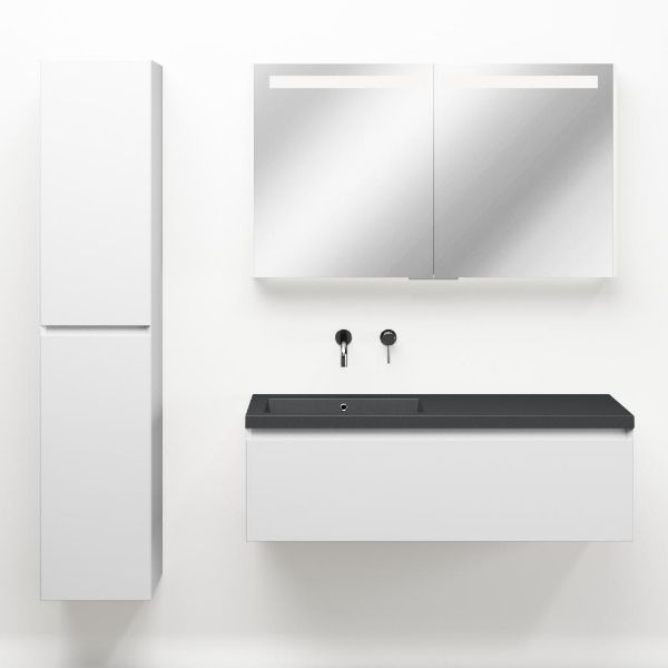 Greeploos badkamermeubel in de kleur wit mat is 120 cm breed. De wastafel is vervaardig in quartz en heeft de kleur grijs mat quartz. Dit badkamermeubel met deze wastafel is leverbaar tussen de 60 cm t/m 160 cm