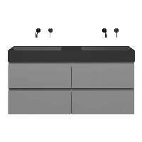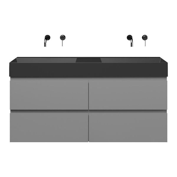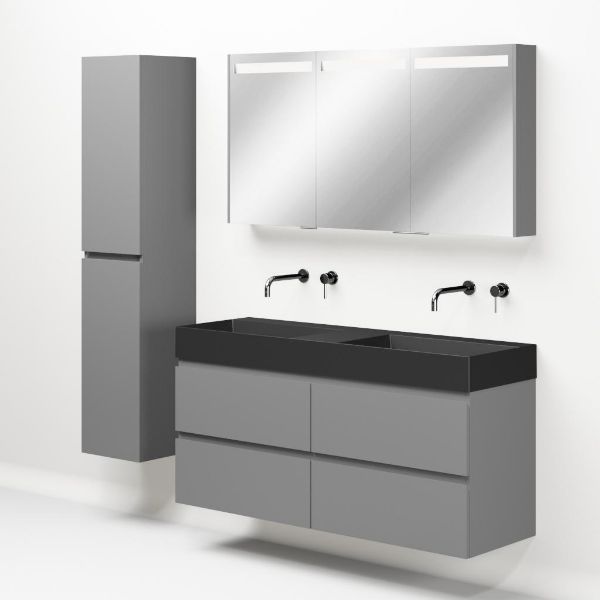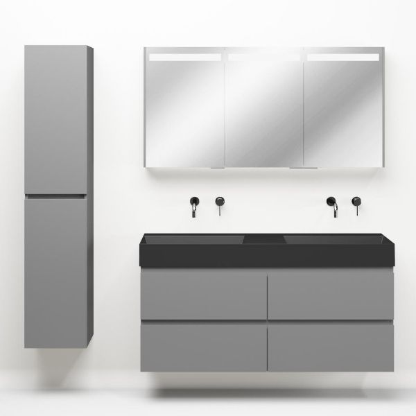 Greeploos badkamermeubel in de kleur licht grijs mat is 140 cm breed. De wastafel is vervaardig in keramiek en heeft de kleur antraciet mat keramiek. Dit badkamermeubel met deze wastafel is leverbaar tussen de 60 cm t/m 160 cm
