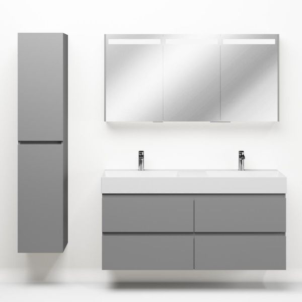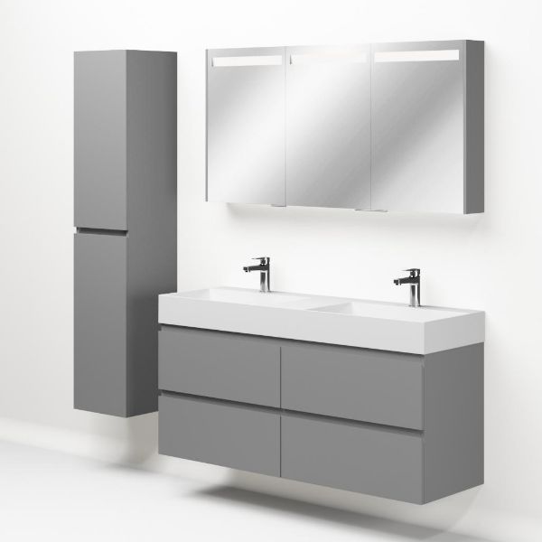 Greeploos badkamermeubel in de kleur licht grijs mat is 140 cm breed. De wastafel is vervaardig in keramiek en heeft de kleur wit keramiek. Dit badkamermeubel met deze wastafel is leverbaar tussen de 60 cm t/m 160 cm
