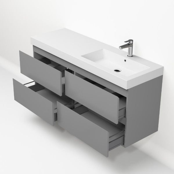 Greeploos badkamermeubel in de kleur licht grijs mat is 140 cm breed. De wastafel is vervaardig in polystone en heeft de kleur wit. Dit badkamermeubel met deze wastafel is leverbaar tussen de 60 cm t/m 200 cm