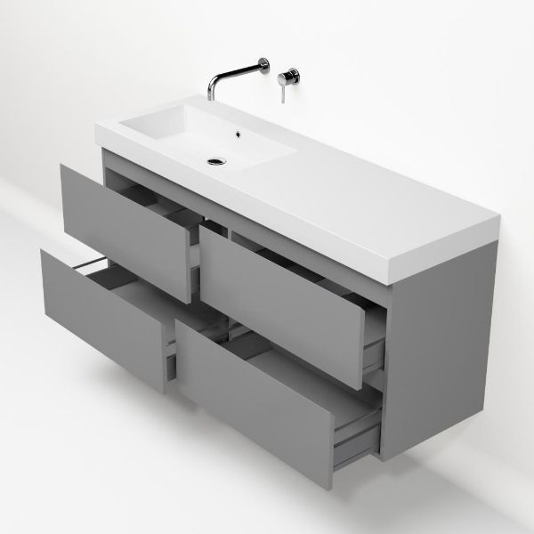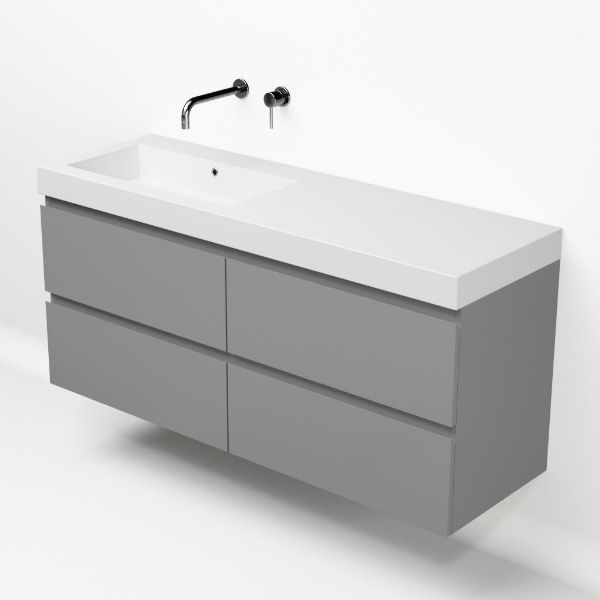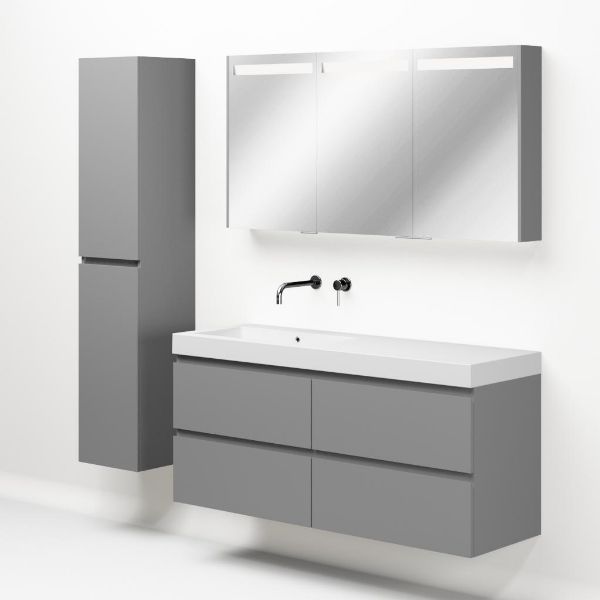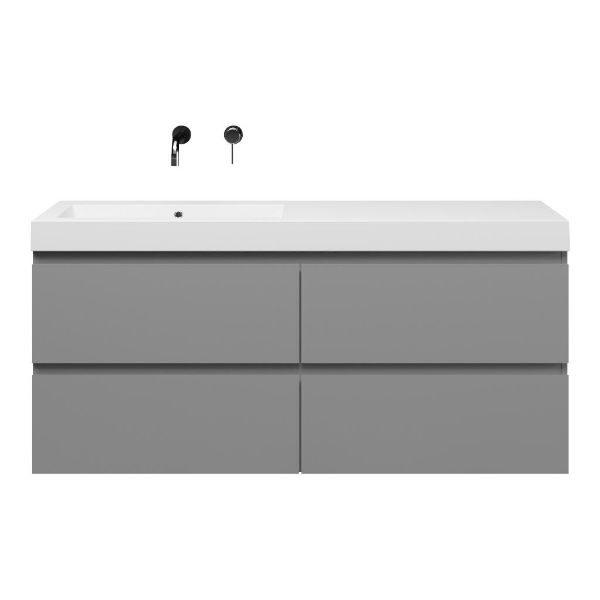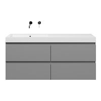 Greeploos badkamermeubel in de kleur licht grijs mat is 140 cm breed. De wastafel is vervaardig in polystone en heeft de kleur wit. Dit badkamermeubel met deze wastafel is leverbaar tussen de 60 cm t/m 200 cm