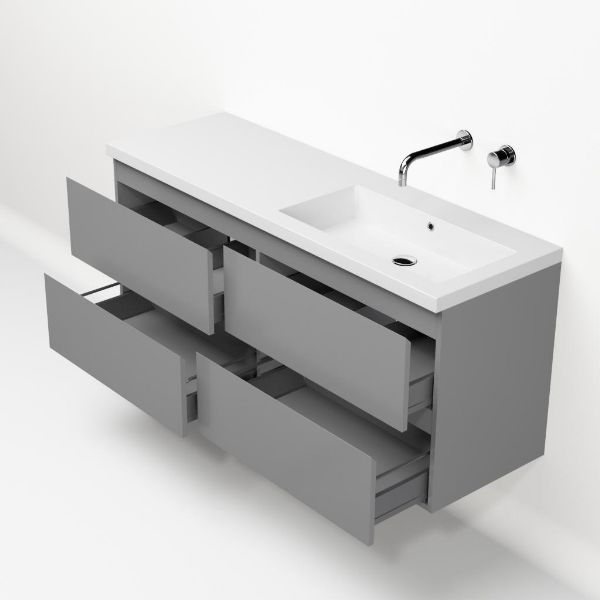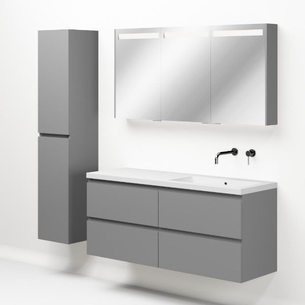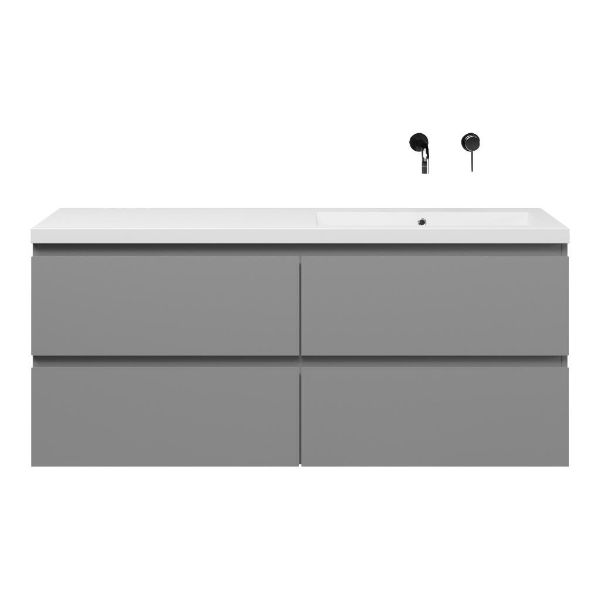 Greeploos badkamermeubel in de kleur licht grijs mat is 140 cm breed.  De wastafel is vervaardig in polystone en heeft de kleur wit. Dit badkamermeubel met deze wastafel is leverbaar tussen de 60 cm t/m 200 cm