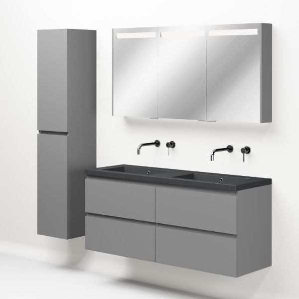Greeploos badkamermeubel in de kleur licht grijs mat is 140 cm breed. De wastafel is vervaardig in quartz en heeft de kleur grijs mat quartz. Dit badkamermeubel met deze wastafel is leverbaar tussen de 60 cm t/m 200 cm