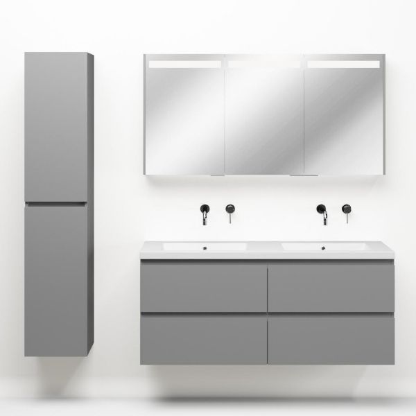 Greeploos badkamermeubel in de kleur licht grijs mat is 140 cm breed. De wastafel is vervaardig in quartz en heeft de kleur wit mat quartz. Dit badkamermeubel met deze wastafel is leverbaar tussen de 60 cm t/m 200 cm