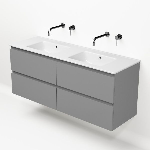 | | Bellanti Gisella/Etna badmeubel 140x46 4 softclose laden licht grijs mat greeploos keramische wastafel dubbel wit zonder kraangat |